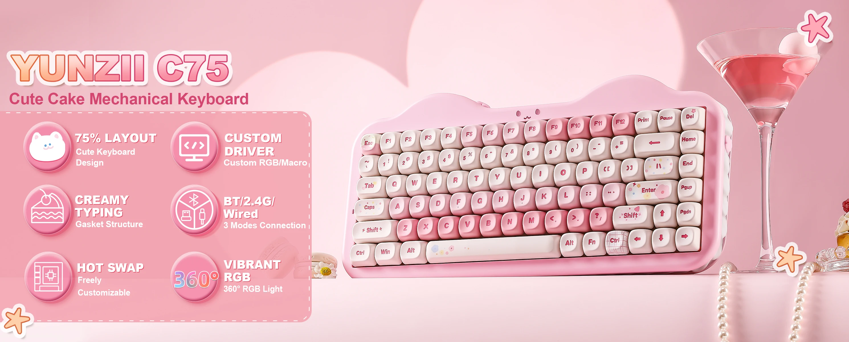 The new YUNZI C75 cute mechanical keyboard series is a delightful addition to desk accessories, featuring a vibrant keyboard design. Boasting all the beloved features—high-quality mechanical keyboard, compact 75% layout Keyboard, wireless, BT, and wired connectivity, and creamy typing sound. This cute wireless gaming keyboard shines as a gift or a charming setup for home, office, workspaces, and gaming stations.