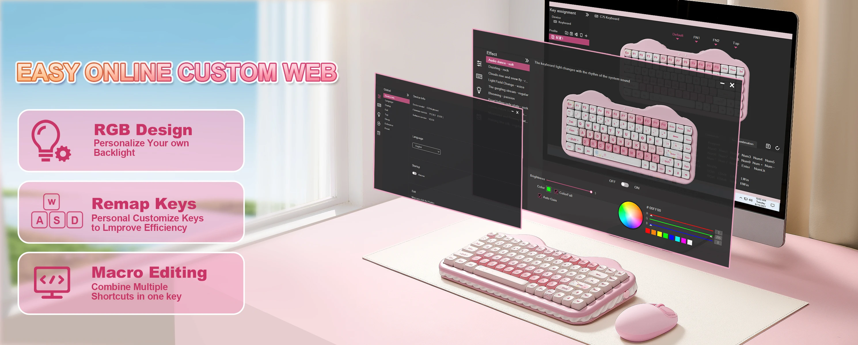 YUNZII C75 cute wireless keyboard offers limitless customization through programmable software, allowing you to remap keys, create complex macros, and personalize RGB backlit for both Windows and Mac systems. Powered by a high-capacity 5500mAh battery, the pc gaming keyboard delivers exceptional endurance, ensures stable performance during extended work sessions and gaming marathons.